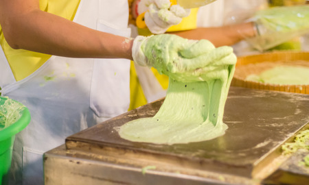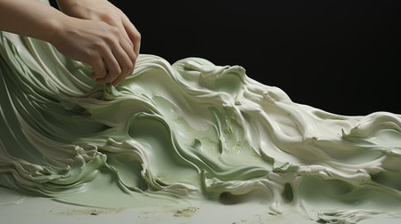 A persons hands are in a green substance that is being poured, AI