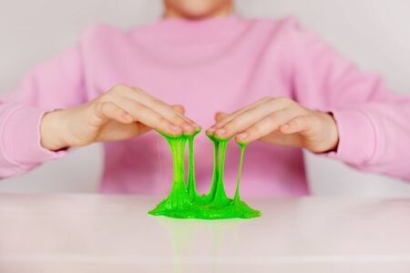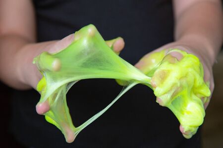 Kid Playing Handmade Toy Called Slime green color, Selective focus on Slime, Teenager having fun and being creative homemade slime