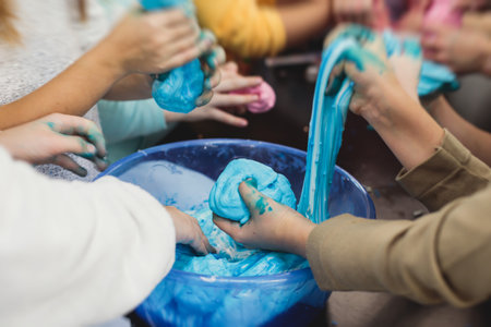 Group of kids making a multicolored slime, pink, blue and white slime toy on kids birthday party, kid playing with slime, homemade slime