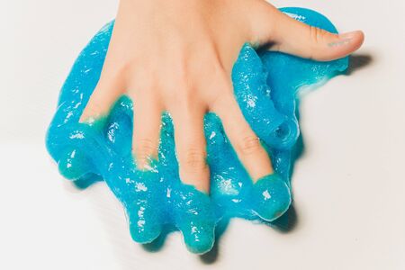 Kid Playing Hand Made Toy Called Slime, Hands Squeeze Isolated on blue background - Image. Happy kid with slime.