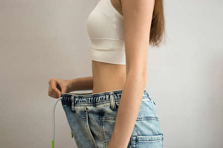 Slim Body of a Woman Who Lost Weight. Young Girl with Thin Waist in Huge Jeans After Losing Weight.