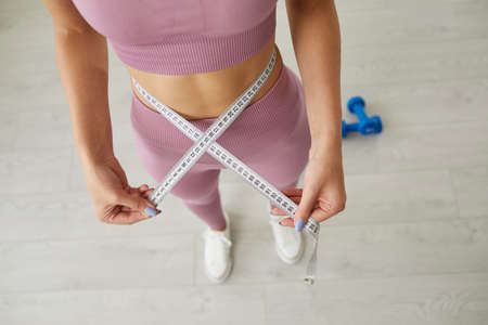 Slim young girl holding tape measure on her thin waist. Unrecognizable sporty woman showing her weightloss achievement after home workouts. Cropped close up, closeup. Beauty and weight loss concept