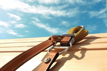 Close-up of safety belt and carbine, concept of cleaning roofs from snow in winter
