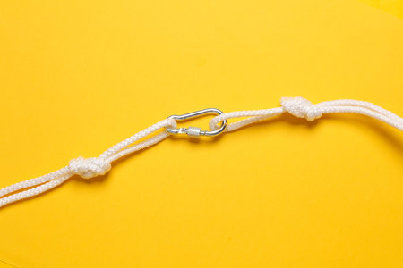 Rope with knots and carabiner on yellow background. Safety, climbing equipment