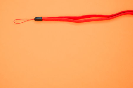 A top view of a red lanyard strap on an orange surface