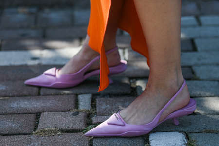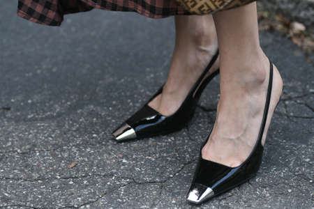 Milan, Italy - September 22, 2021: Street style outfit, woman wearing a fashionable outfit, shoes detail, on the streets of Milan, Italy.