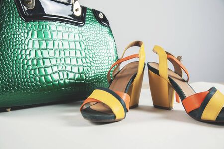 woman shoes with bag on white table