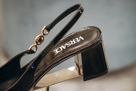 Bologna, Italy - October 6, 2024: Women's shoes in the window of a Versace boutique