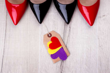 Label with hearts. Bright hearts and shoes. Created with love. Special discounts to Valentine`s Day.