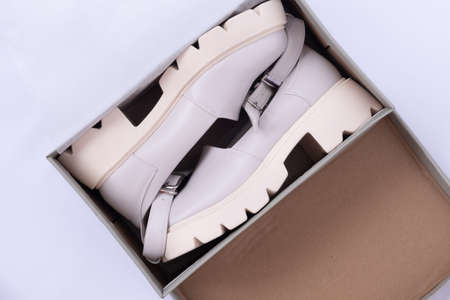 View from above. In the box are new shoes with massive soles. Beige fashion shoes. Mary Jane shoes
