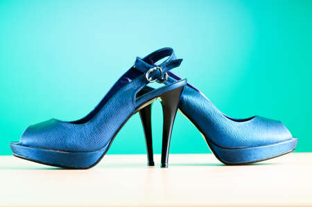 Stylish female shoes on color background