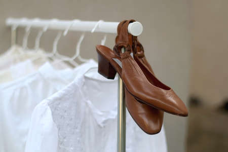Clothing rack with white and neutral garments and brown vintage shoes. Selective focus.