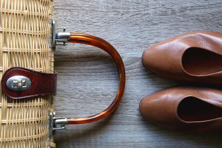 Vintage straw bag and brown vintage shoes on wooden background. Flat lay.