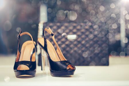 Close up shot of black elegant high heel women shoes or sandals , with woman purse. Copy space.