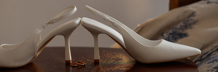 Banner close-up of wedding rings and high heels on wooden floor.