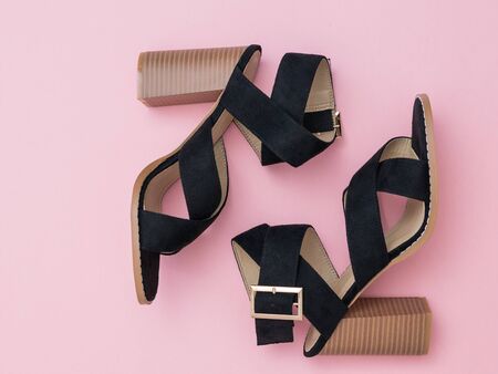 A pair of black summer shoes with high heels on a pink background. Fashion women's shoes.