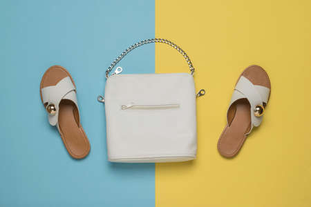 White women's bag and sandals on a yellow and blue background. Fashion women's accessories. Flat lay.