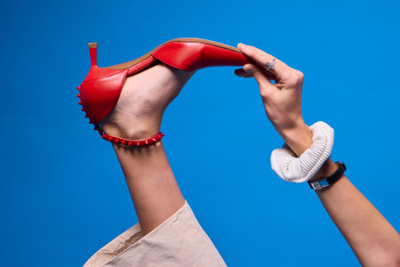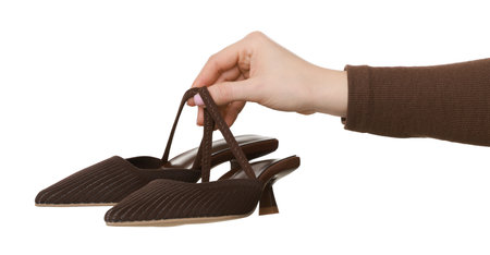 woman hand holding shoes in the studio
