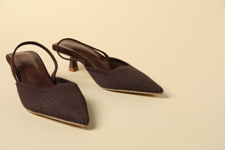 Pair of brown high heeled shoes on beige background