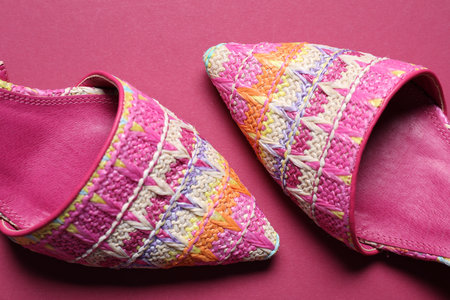 Vivid shoe arrangement featuring fashionable heel against lively background. Brightly colored shoe display highlighting elegant high heel with vibrant backdrop for visual appeal.