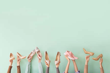 Many hands with different stylish shoes on color background