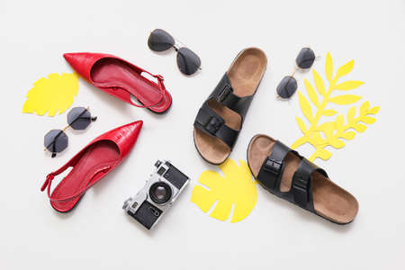 Composition with beach accessories on white background