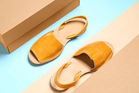 Cardboard boxes with yellow sandals on color background