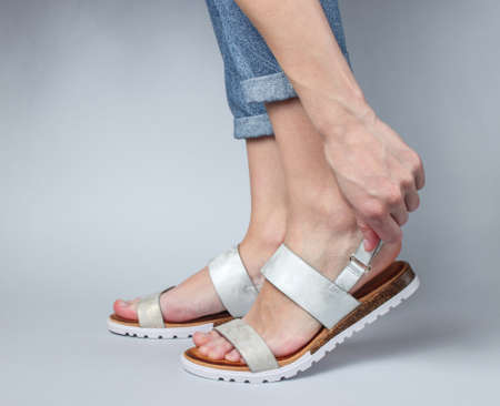Woman shoes stylish leather sandals on her foot on a white background