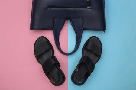 Women's leather sandals and bag on pink-blue pastel background. Women's accessories. top view. flat lay