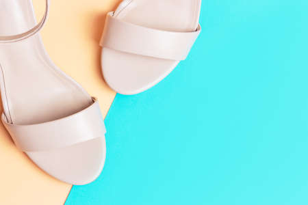 Female sandals on beige and blue background close-up copy space.