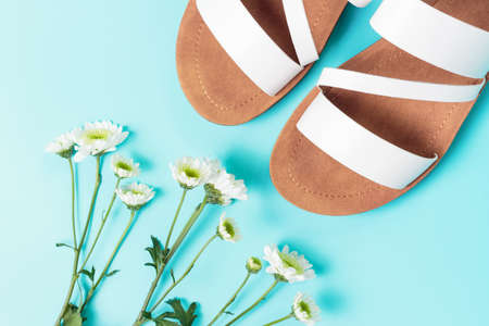 The white sandals and flowers on blue background top view.