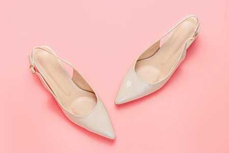 Beige female shoes on pink background close up top view.