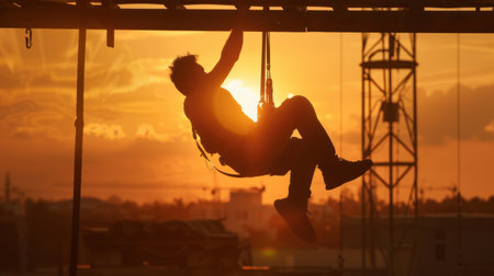 Silhouette of person hanging from structure against vibrant sunset, showcasing determination and adventure. scene captures essence of hard work and beauty of nature