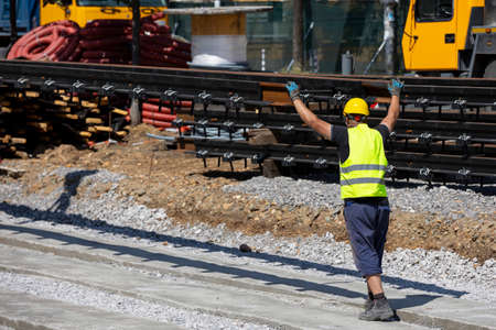Slinger in helmet unloads metal pipes on construction site on sunny summer day. Real scene. Workflow. Real worker.