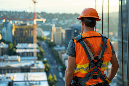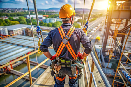 A working at height equipment, Construction worker wearing safety gear working at construction site.