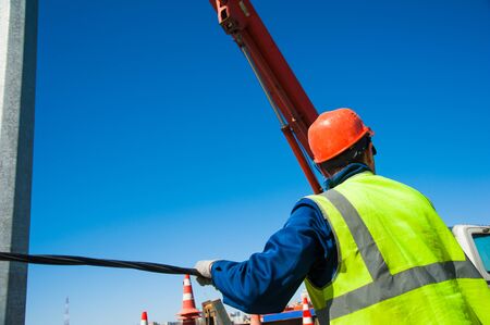 Electrician lineman repairman worker at climbing work on electric post power pole