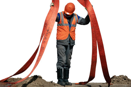A slinger in a helmet and overalls unloads the load using slings. Isolated full-length portrait of a worker on a white background. A man at work in production.