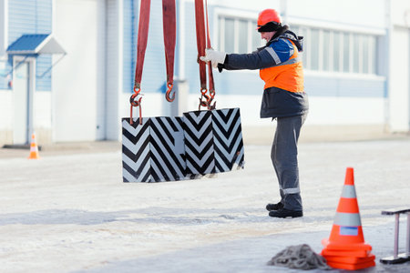 Loading and unloading operations on street. Worker in warm winter clothes and helmet clings hooks to concrete blocks. Training of slingers. Real scene.