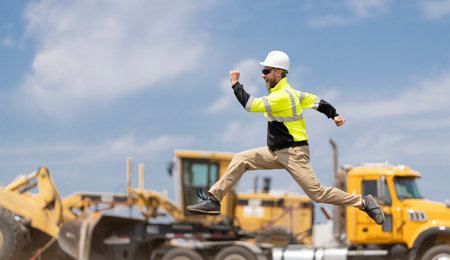 Worker jumping at heavy machines. Man engineer running to success. Builder man run fast to work. Engineer supervisor running outdoor. Supervisor jumping. Excited construction builder, banner