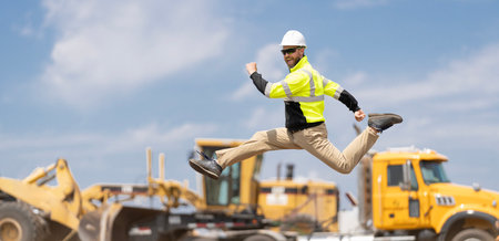 Worker jumping at heavy machines. Man engineer running to success. Builder man run fast to work. Engineer supervisor running outdoor. Supervisor jumping. Excited construction builder. Project success