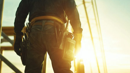 A construction worker stands at sunrise, facing the horizon. The image showcases the essence of dedication in building, with tools visible in the belt.