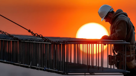 A man is working on a construction site with a large metal structure in front of him. The sun is setting in the background, casting a warm glow over the scene. The man is wearing a hard hat