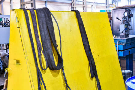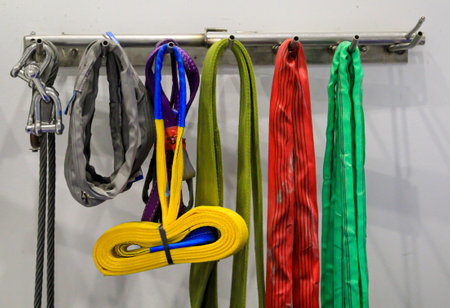 Nylon slings for lifting loads on the telpher crane lie on the rack.