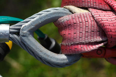 Hooks on slings close-up. Industrial equipment for loading or unloading cargo. Background.