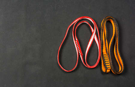 climbing equipment folded on an orange rope. modern equipment for climbing in the mountains. adventure on the rocks.