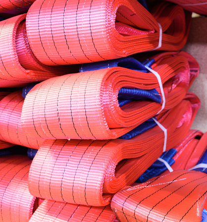 Red nylon soft lifting slings stacked in piles. Warehouse of finished products for industrial enterprises