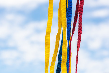 Flag of Colombia made with shoelaces, hanging on a background of the sky and clouds