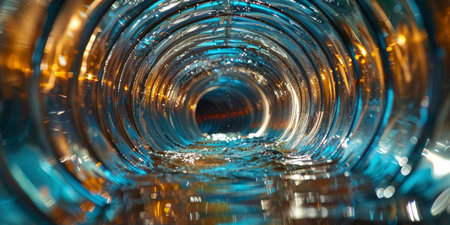 A mesmerizing view of water flowing through a tunnel, with vibrant reflections, creating an enchanting atmosphere