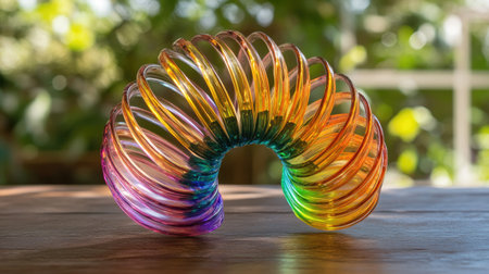 A vibrant spiral toy rests on a wooden surface, highlighted by soft sunlight and surrounded by lush greenery, evoking childhood joy and creativity.