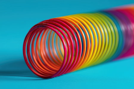 A vibrant and colorful spring toy, also known as a slinky, is displayed against a bright blue background. The image captures the playful and dynamic nature of this classic toy, showcasing its rainbow colors and spiral form.ai generated.